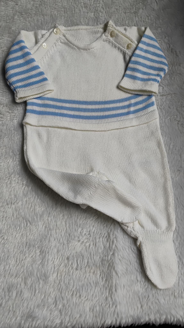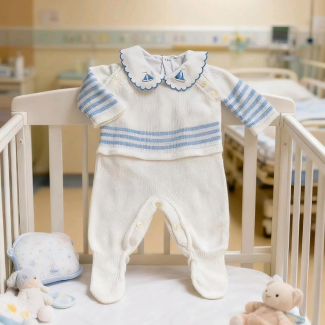 Kit maternidade à pronta entrega, composto por macacão em tricô artesanal em linha e body com gola bordada, em tons suaves e delicados. Um conjunto pensado para os primeiros dias do bebê, unindo conforto, elegância e muito carinho. Ideal para saída de maternidade ou presente especial.